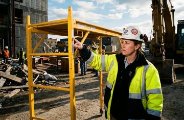 A professional construction manager in a safety vest and helmet inspecting the spacing of a scaffolding structure with a measuring tape, serious and expert tone.